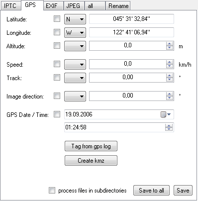 The GPS tab works like the IPTC tab. The GPS tags are display and you can edit and save them - using the checkboxes as descripted before.
