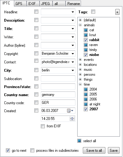 For each tag there is a checkbox left to its textbox. Only checked tags are saved in the jpg file. Using this checkboxes you can prevent certain tags from being overwritten by the save-to-all function. The save-to-all function writes the values of the checked tags to all selected files.